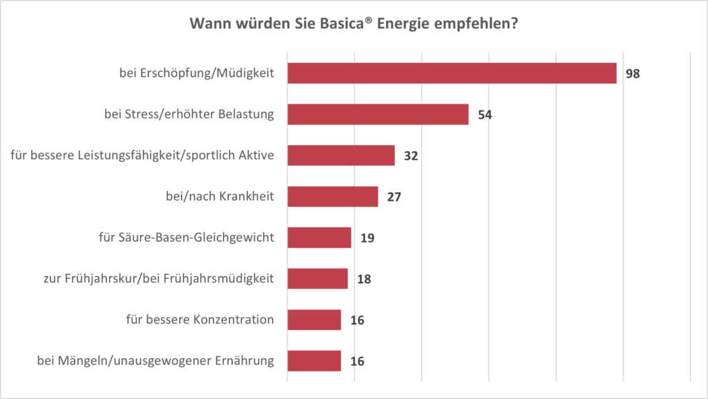 91 % der testenden PTA würden Basica® Energie weiterempfehlen, vorrangig zu den Kernthemen Erschöpfung/Müdigkeit und Stress/erhöhte Belastung.